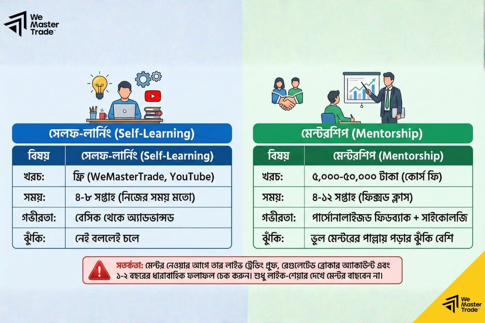 | খরচ | ফ্রি (WeMasterTrade, YouTube) | ৫,০০০-৫০,০০০ টাকা (কোর্স ফি) |