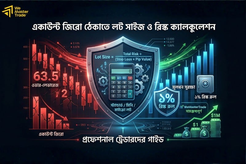 ফরেক্স ট্রেডিংয়ে দীর্ঘমেয়াদী সাফল্যের মূল চাবিকাঠি হলো সঠিক লট সাইজ (Lot Size) এবং ১% রিস্ক রুলের (1% Risk Rule) নিখুঁত প্রয়োগ। ওভার-লেভারেজ বা ভুল ভলিউমে ট্রেড ওপেন করা অ্যাকাউন্ট জিরো হওয়ার প্রধান কারণ। এই গাইডে স্ট্যান্ডার্ড, মিনি এবং মাইক্রো লটের পার্থক্য থেকে শুরু করে স্টপ লস ও পিপস ভ্যালুর গাণিতিক সূত্র আলোচনা করা হয়েছে। উইমাস্টারট্রেডের (WeMasterTrade) মতো প্রপ ফার্মের ৫% ডেইলি ড্রডাউন লিমিট এড়িয়ে চ্যালেঞ্জ পাস করতে এবং মূলধন সুরক্ষিত রাখতে এই পজিশন সাইজিং ক্যালকুলেশনগুলো জানা প্রত্যেক ট্রেডারের জন্য অপরিহার্য।