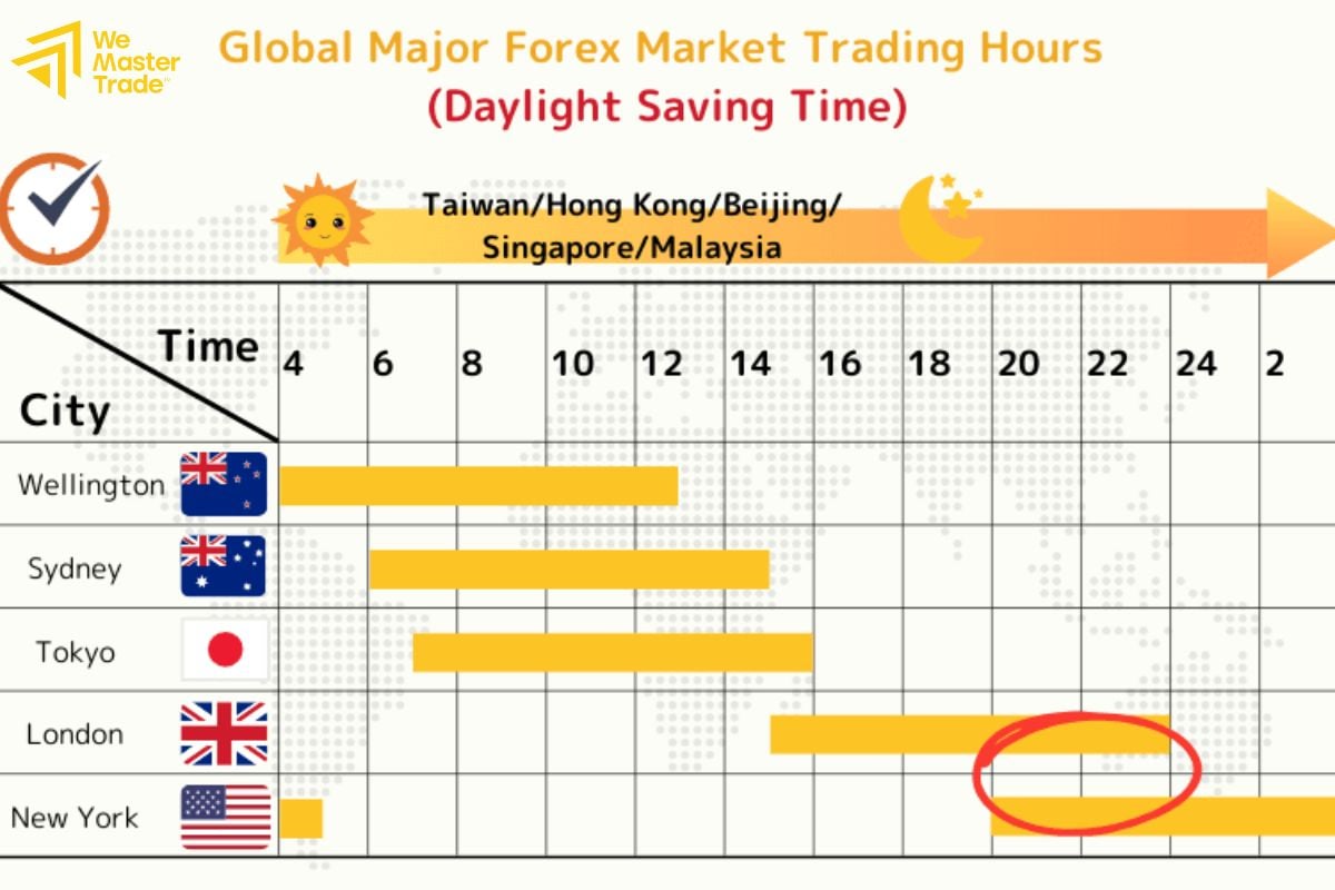 - Daylight Saving Time: Some countries such as the US and the UK change trading hours in March, April, October, and November.