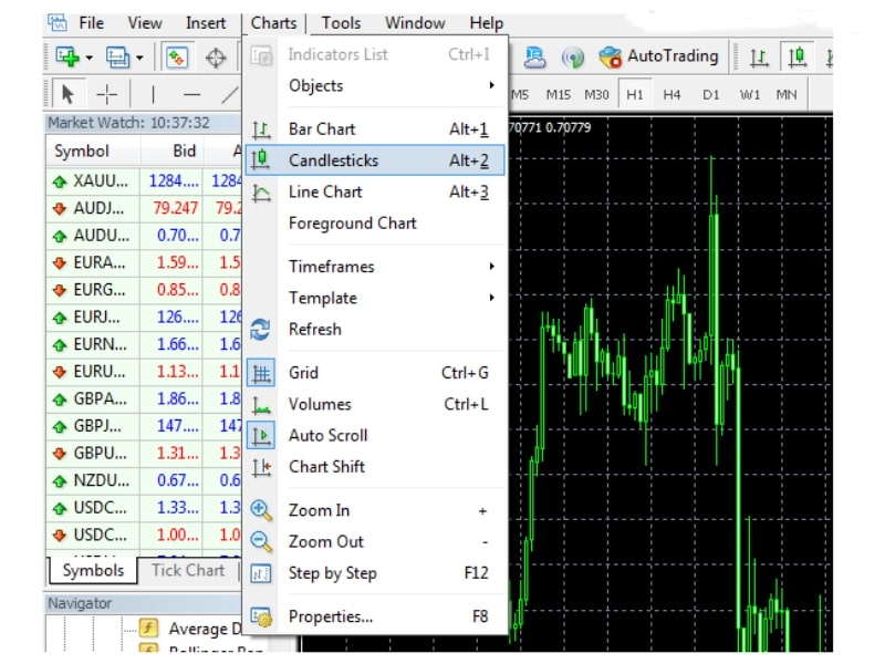 MT4 offers three types of price charts (located on the toolbar or via keyboard shortcuts):