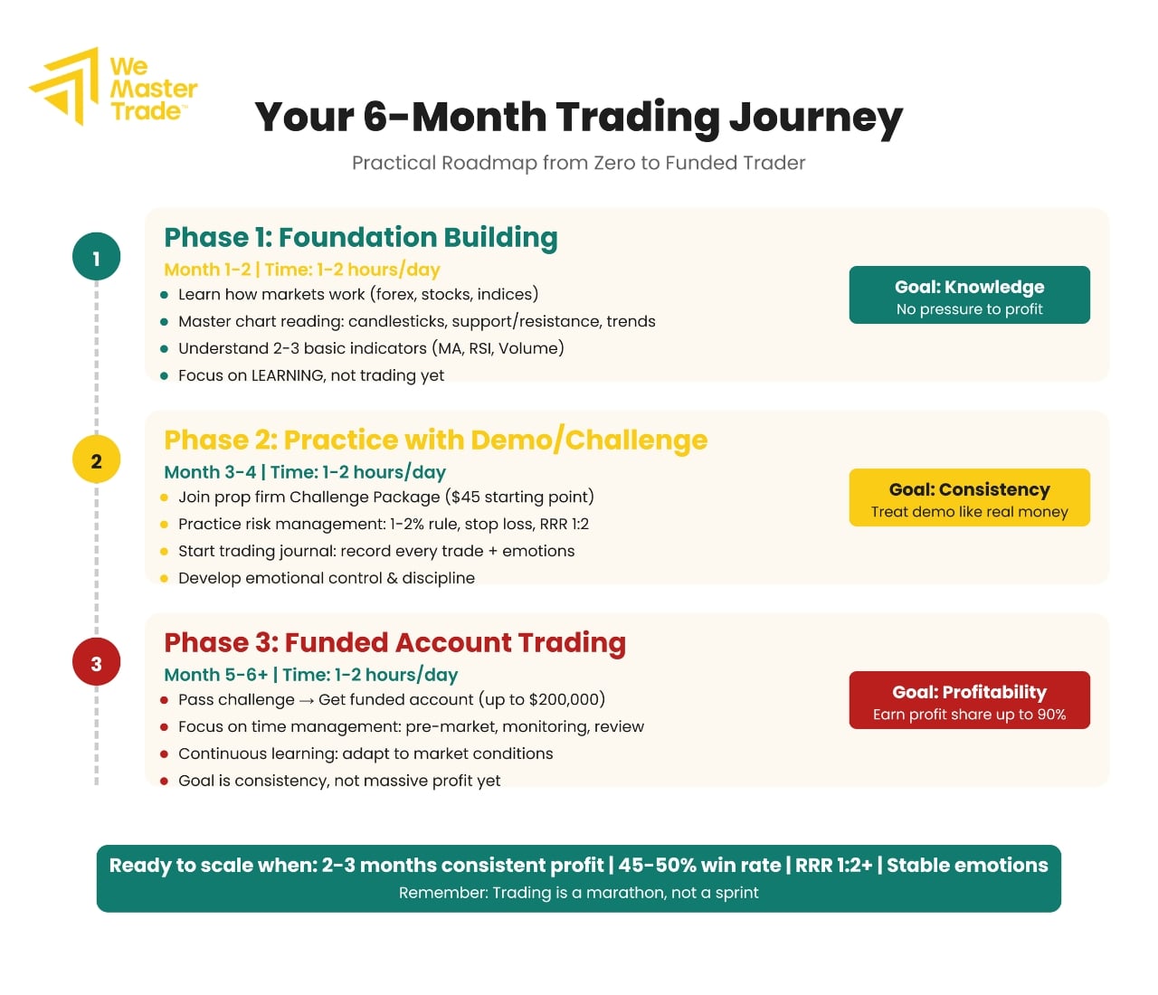 Tidak harus sempurna, tapi setidaknya kamu harus paham dasar-dasar dari ketujuh skill ini. Dengan prop firm, kamu bisa belajar sambil praktek dengan risiko yang terkontrol.