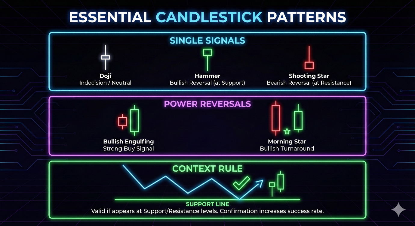 Nah, ini yang bikin cara belajar trading kamu naik level. Candlestick pattern akan jauh lebih powerful kalau muncul di area support atau resistance.