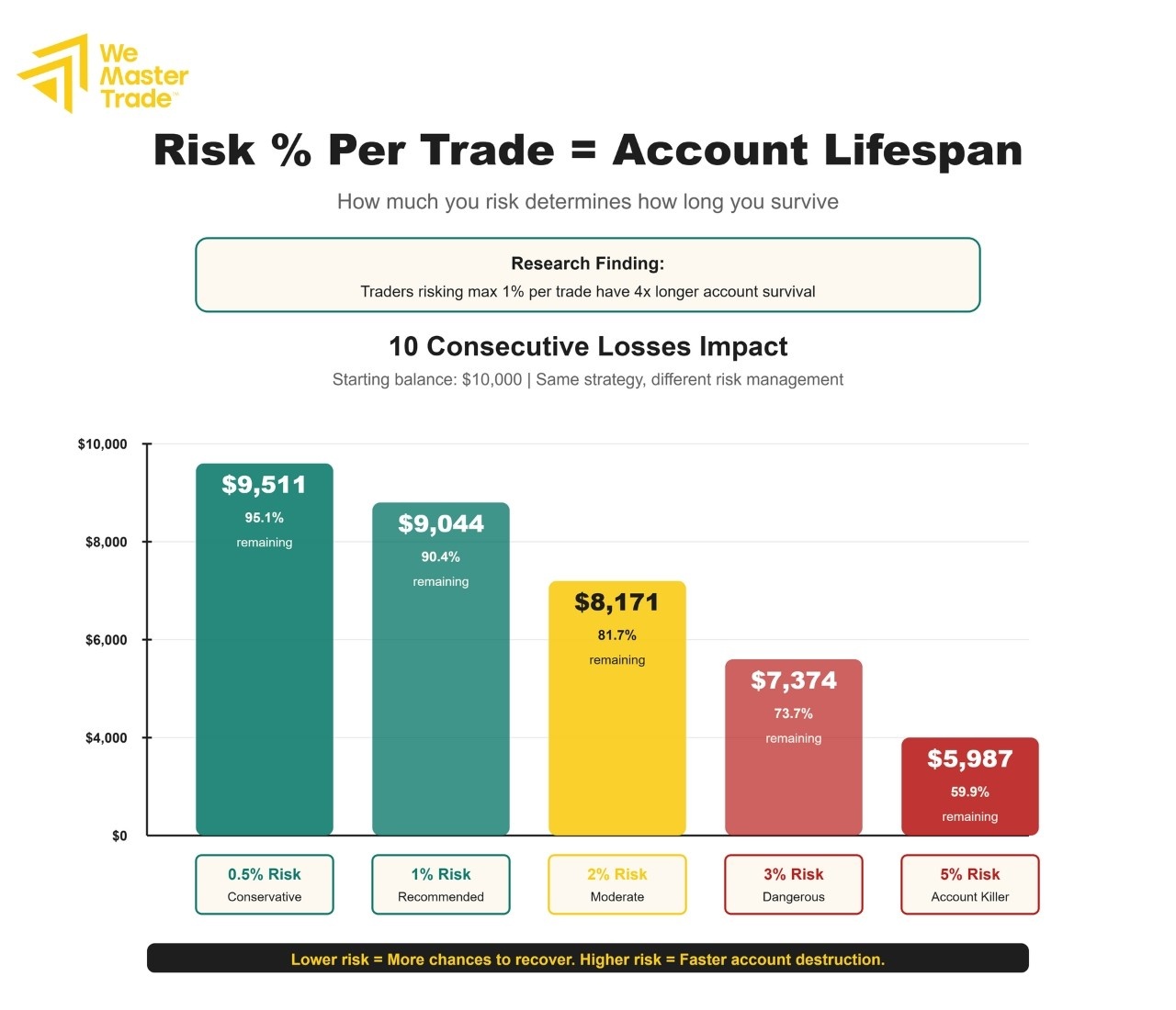 Mengapa angka ini penting? Bayangkan kamu mengalami 10 kali loss berturut-turut. Dengan risiko 1% per trade, total drawdown kamu hanya sekitar 9,6 persen dan masih sangat bisa dipulihkan.