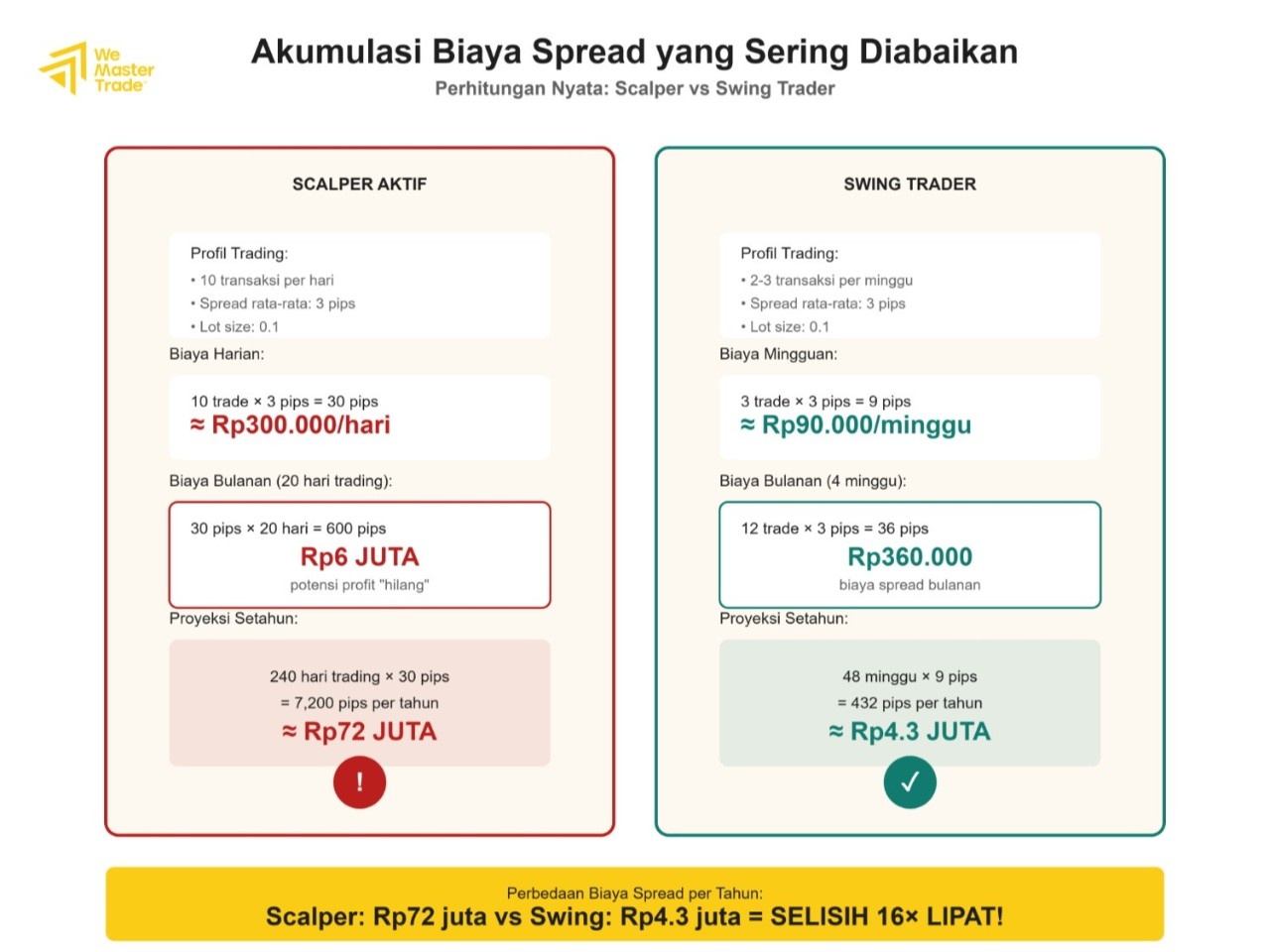 Dalam setahun: $12.000 atau sekitar Rp186 juta hanya dari perbedaan 1 pip spread. Inilah mengapa memilih platform dengan spread kompetitif seperti di WeMasterTrade berdampak langsung ke profitabilitas jangka panjang kamu.