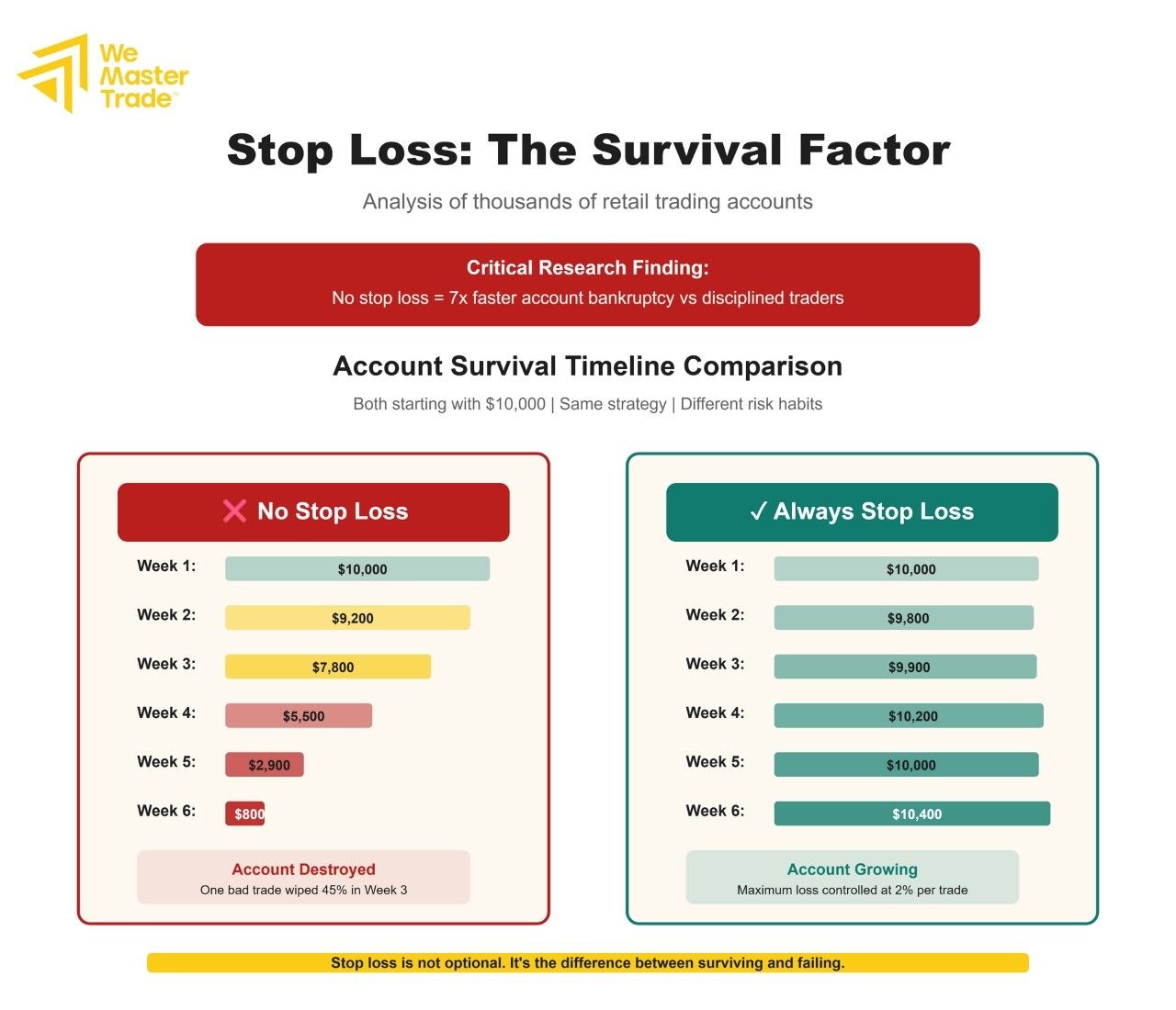 Trader yang menggunakan stop-loss (88% dari trader sukses) dan position sizing yang proper (62%) memiliki peluang bertahan jauh lebih tinggi. Sementara yang mengabaikan kebiasaan dasar ini cenderung masuk dalam statistik 97% yang gagal.