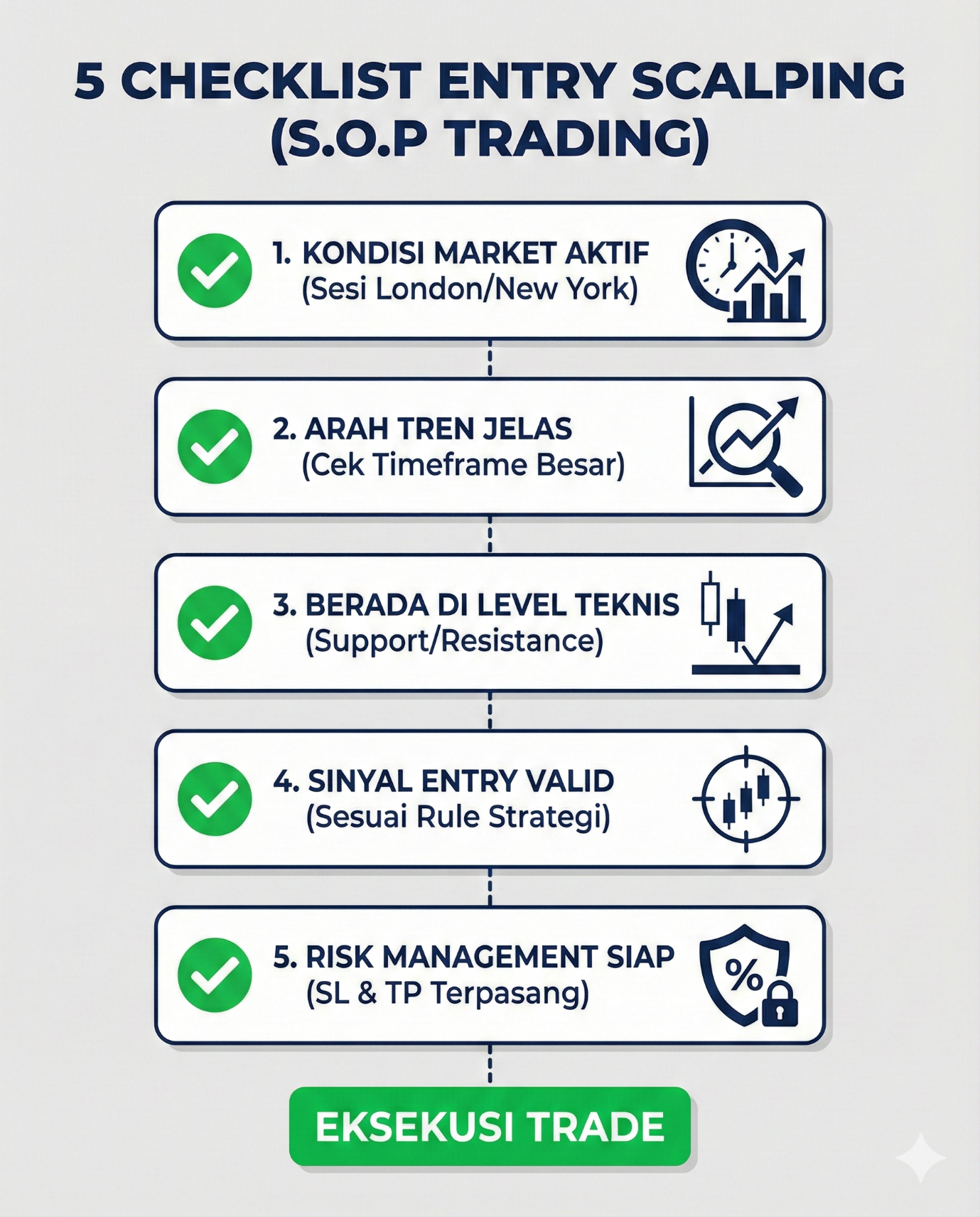 Checklist membantu eksekusi strategi scalping terbaik lebih disiplin dan konsisten. Semua poin ini harus terpenuhi sebelum masuk posisi.