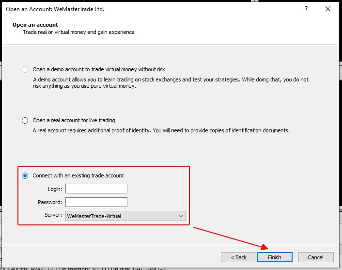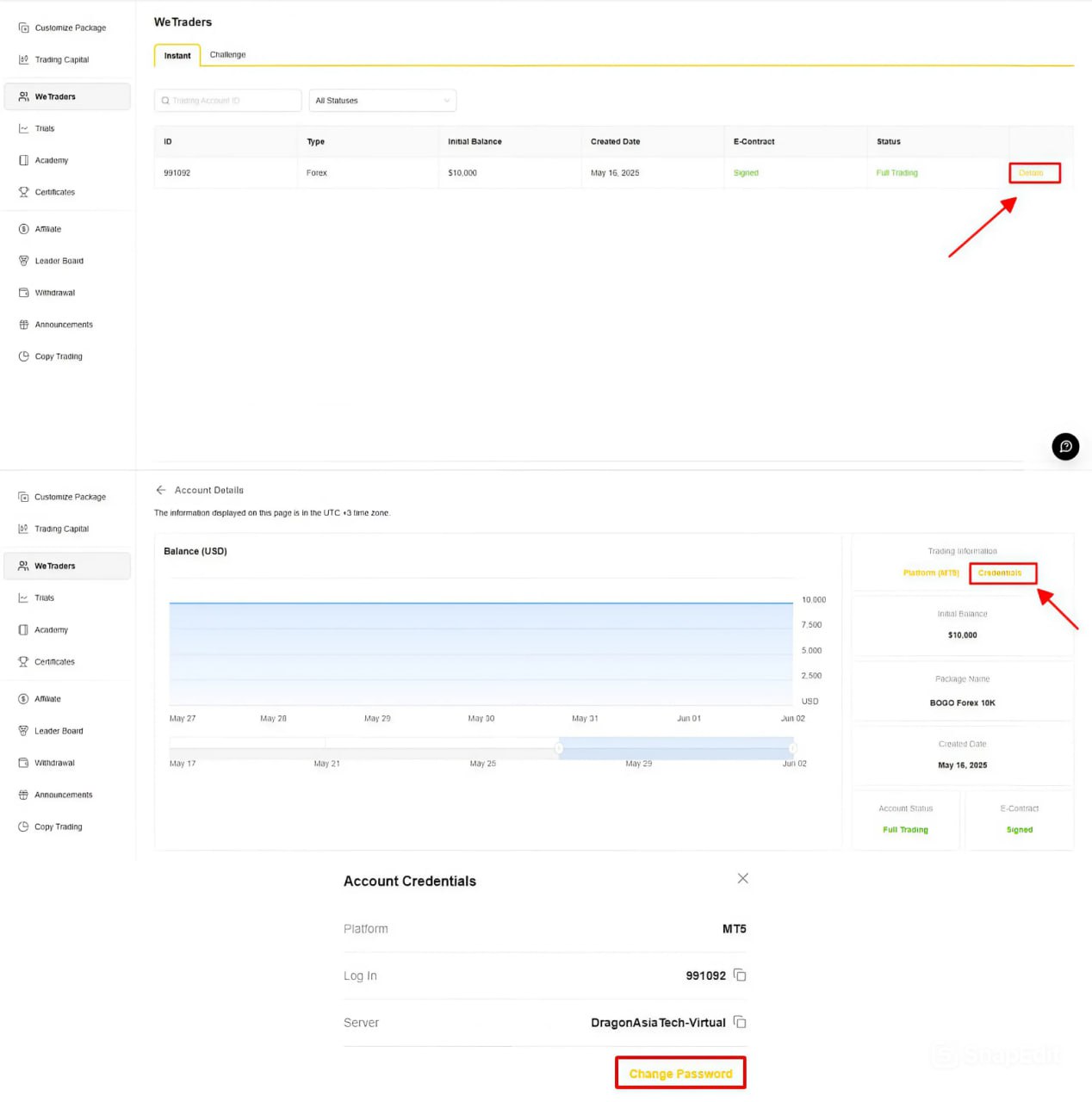 Log in to my.wemastertrade.com > WeTraders > and select your account > Credentials > “Change Password” option before accessing MT5.