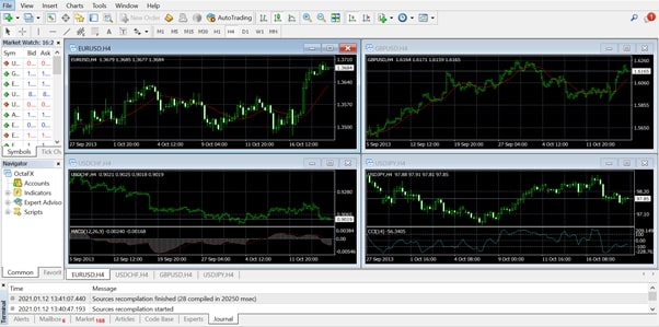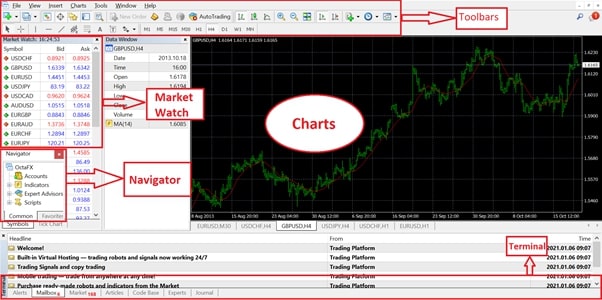 The MT4 interface may look confusing at first. You only need to focus on the 4 main areas below to master how to use MT4:
