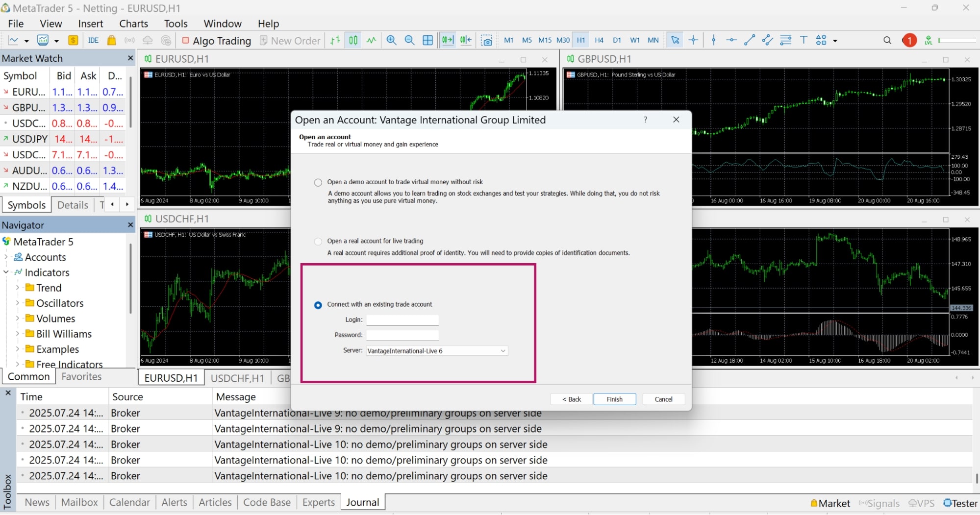 - Navigator: Located below Market Watch, used to manage accounts and add technical indicators. Press Ctrl + N to hide/show.