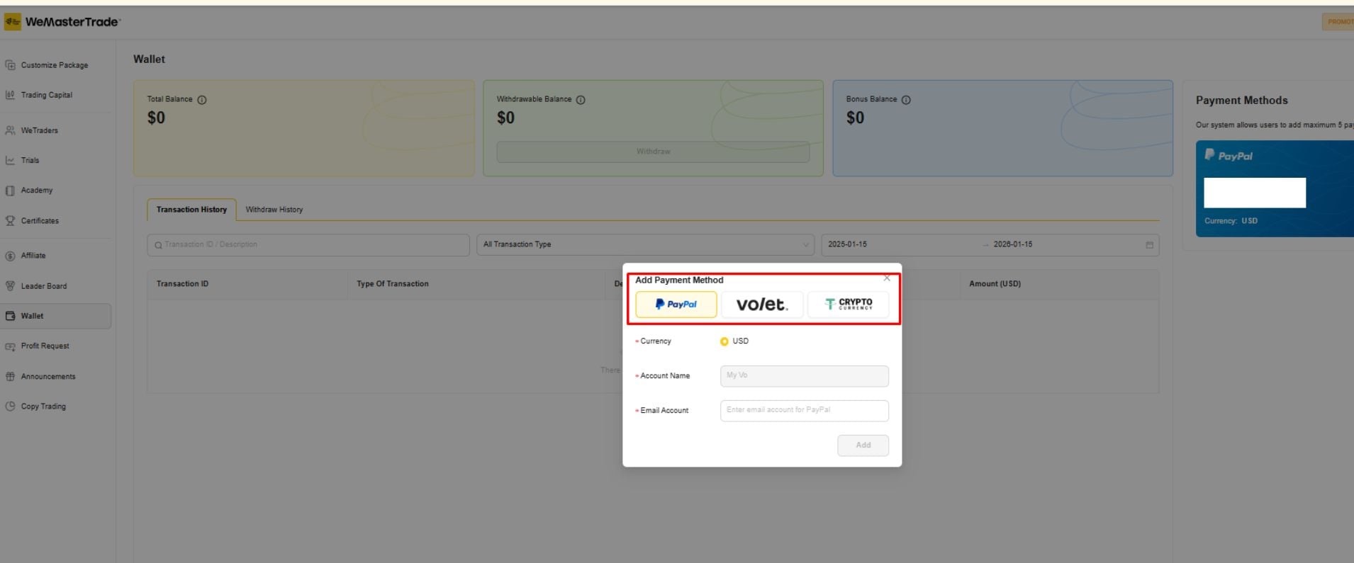 - Submit a withdrawal request by selecting your preferred payment method such as PayPal, Volet, or Crypto. All withdrawal requests are recorded and tracked directly within Wallet.
