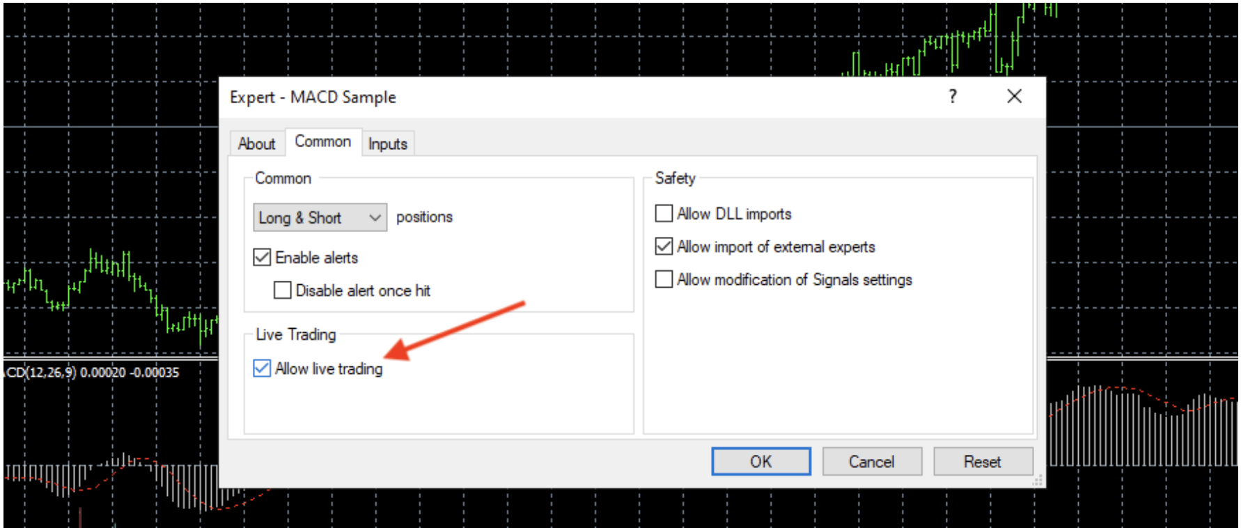 - Common tab: Check the boxes “Allow live trading” and “Allow DLL imports”.