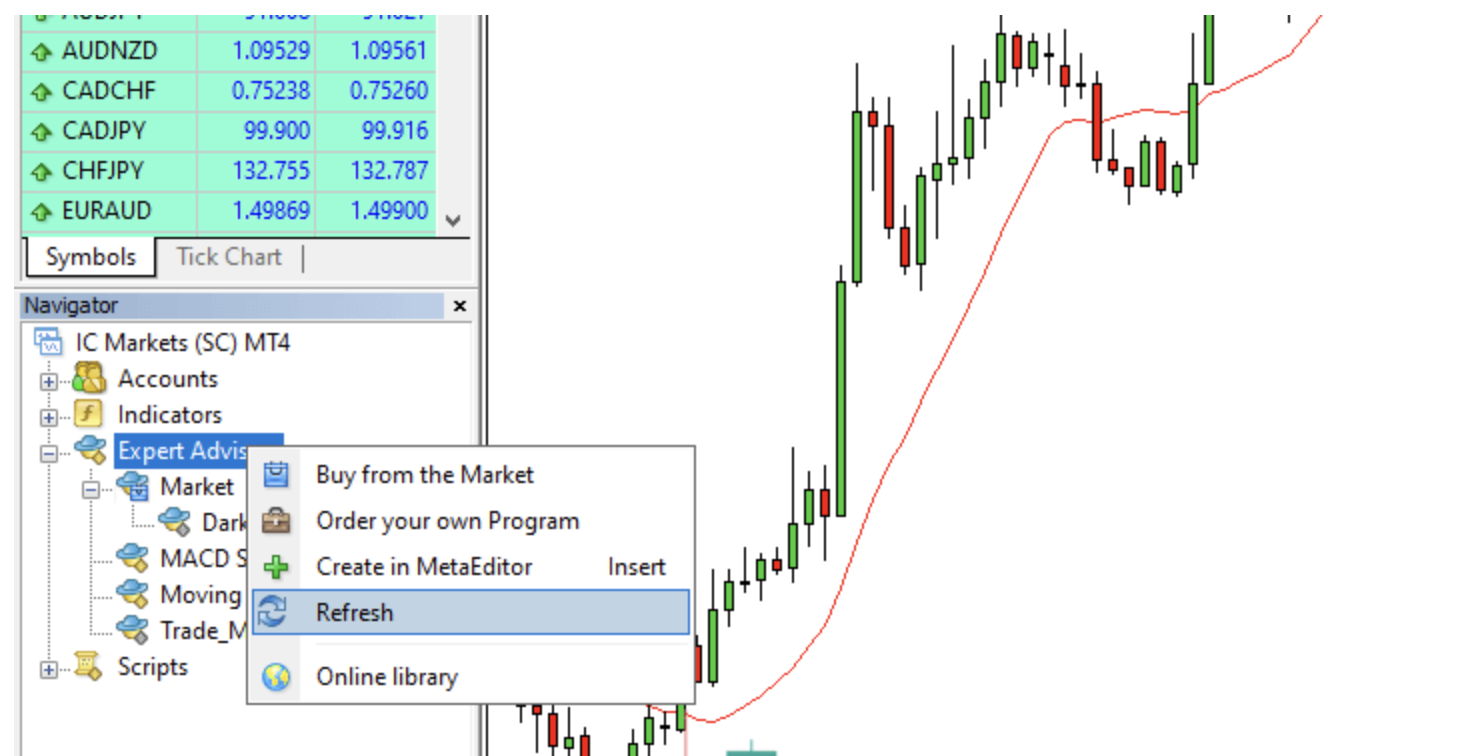 - From the Navigator column, drag and drop the EA name into the center of the chart.